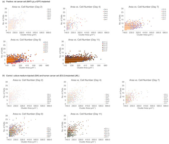 In this study, as a follow-up examination of our previous work [20], to resolve the important issue of what happens in blood during progression in metastatic cancer, we examined the time-course change of CTC clusters of GFP-MAT-LyLu in positive rat blood over time after implantation. Their increase was detected by monitoring the time-course change of the distribution of imaging biomarkers as shown in Figure 4, Figure 5, Figure 6, Figure 7, Figure 8, Figure 9, Figure 10, Figure 11, Figure 12 and Figure 13.