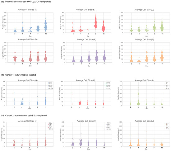 Time-course change of average size distribution of cells in positive (a), control 1 (b), and control 2 blood (c). Each value represents 2, 4, 7, 9, or 11 days after the implantation of rat cancer cells (A–F, six positive rats), culture medium (G–I, three rats of control 1), or human cancer cells (J–L, three rats of control 2). For each case, the x-axis represents the population at each average cell or cell cluster size on the y-axis.