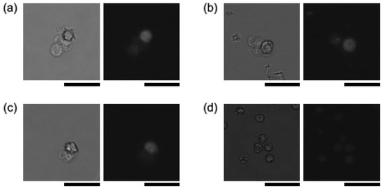 Three typical cell cluster images in positive cases (a–c) and a cell image in control 1 (d). Left, BF, and right, FL images. All FL images were taken with the same camera conditions. Bars, 50 μm.