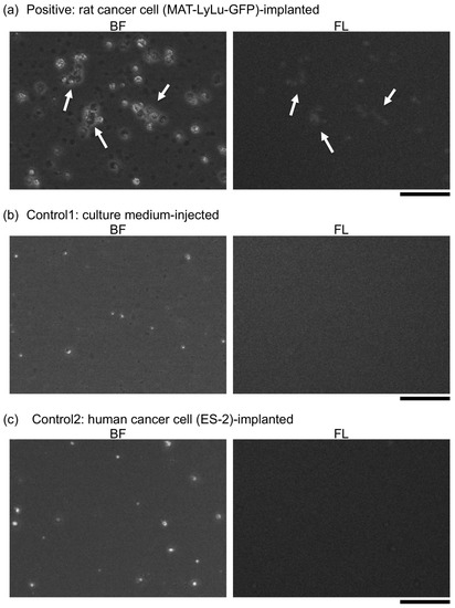 To confirm the obtained findings, cell clusters of 200 μm2 or larger were collected by our cell sorting system, and their GFP fluorescence was observed with a fluorescence optical microscope. It was confirmed that they were implanted cancer cells because of their green fluorescence, that is, CTCs with GFP fluorescence (Figure 14 and Figure 15). Therefore, we concluded that CTCs started to form large clusters from Day 7 and increased in number over time.
