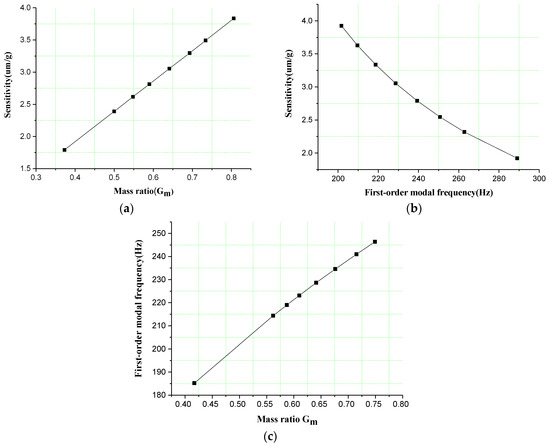 The effect of mass ratio and first-order modal frequency on mechanical sensitivity is shown in Figure 4. As can be seen from Figure 4a,b, the mechanical sensitivity is clearly proportional to the mass ratio at the same first-order modal frequency and inversely proportional to the first-order modal frequency at the same mass ratio. Simultaneously, the first-order modal frequency is proportional to the mass ratio under the same mechanical sensitivity conditions, shown in Figure 4c. That is, in order to maintain the same mechanical sensitivity, the mass ratio must be increased accordingly when the first-order mode is added. Actually, the increase of the mass ratio is beneficial to enhance the mechanical sensitivity. In the limit case, if m1 = 0, the maximum mass ratio can be obtained, which can implement the maximum mechanical sensitivity. However, a compromise design has been made in order to be compatible with the electrostatic torque devices in the structure. Reverse electrostatic forces for closed loop feedback control are implemented by the electrostatic torque devices which are constituted by a pair of differential masses (m1 and m2) with a pair of differential electrodes and lever mechanisms. In summary, the above simulation results are in good agreement with the above theory, which confirms the correctness of theoretical analysis.