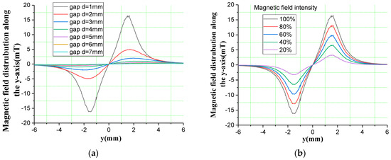 The magnetic field data under different conditions are extracted for further quantitative analysis. The magnetic field distribution in the y direction is mainly considered since the sensitive direction of the tunnel magnetoresistive sensor is the y axis. Figure 6 shows the magnetic field characteristic in different conditions.