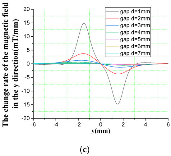 Further, a numerical simulation is differentiated to abstract the change rate of the magnetic field due to the displacement variation in the z directions. Apparently, the change rate of the magnetic field in the y direction due to a displacement variation in the z direction decreases as the gap increases, shown in Figure 6c. The maximum change rate of the magnetic field is reduced from 14.8 mT/mm to 0.079 mT/mm when the gap is increased from 1 mm to 7 mm. Simultaneously, the change rate of the magnetic field due to a displacement variation along the z direction in different horizontal shift between the tunnel magnetoresistive sensor and permanent magnetic film is shown in Figure 6c. The change rate of the magnetic field is essentially zero when horizontal shift y = 0, which indicates that the minimal sensitivity in the tunneling magnetoresistive sensor appears at this point. The main reason for this is that the direction of the magnetic field is orthogonal to the sensitive direction of the tunnel magnetoresistive sensor at this point, which is basically consistent with the finite element simulation of Figure 5b. At the same time, when the horizontal shift is equal to 1.5 mm, the change rate of the magnetic field in the y direction has approximately the largest absolute value, which demonstrates that the tunneling magnetoresistive sensor has the greatest sensitivity at the boundary of the permanent magnetic film. This is also the theoretical basis for the layout optimization of the tunneling magnetoresistive sensor.