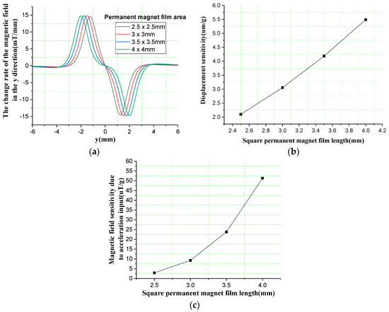 The structure dimension of permanent magnetic film not only affects the distribution of the magnetic field, but also affects the mechanical sensitivity. Figure 7 shows the influences of structure dimension of permanent magnetic films on characteristics of the tunneling magnetoresistive accelerometer. Obviously, the variation in the structure dimension of the permanent magnet film causes the maximum change rate of magnetic field to appear at different positions, shown in Figure 7a. However, all the maximum change rates of magnetic field appear almost around the boundary of the permanent magnetic film. At the same time, the mechanical sensitivity of the displacement increases by 2.62 times as the structure dimension of permanent magnetic film widens from 2.5 mm × 2.5 mm to 4 mm × 4 mm, as shown in Figure 7b. Combining the above two effects, the change rate of the magnetic field in the y direction due to input acceleration in the z direction is proportional to the change of structure dimension of the permanent magnetic film, as shown in Figure 7c. As the structure dimension of the permanent magnetic film is enlarged from 2.5 mm × 2.5 mm to 4 mm × 4 mm, the magnetic field sensitivity in the y direction due to input acceleration in the z direction increases by 17.62 times.
