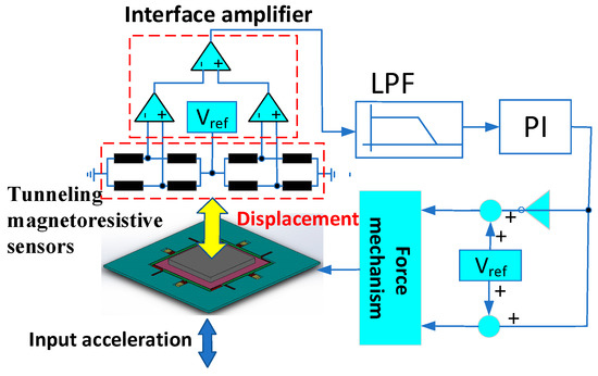 The scheme of the measurement and control circuit is shown in Figure 8. The displacement of the permanent magnetic film due to input acceleration causes the resistance change of the tunnel magnetoresistive sensor. Two resistance bridges are formed by eight tunneling magnetoresistive sensors arranged on the two boundaries of the permanent magnetic film. An interface amplifier circuit consisting of three operational amplifiers is used to measure resistance changes. Then, the signal is filtered by a low pass filter (LPF) and control signals are generated by the proportional-integral (PI) controller. Finally, the output signal of the PI controller is divided into two paths, which are respectively applied to the two feedback electrodes. The feedback correction force is generated by the electrostatic force mechanism to realize the closed-loop detection of the tunneling magnetoresistive accelerometer.