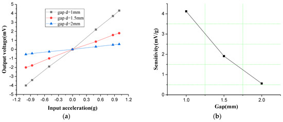 Acceleration input and output response characteristics under different gaps in the tunneling magnetoresistive accelerometer. (a) Input acceleration versus output voltage under different gaps; (b) The sensitivity versus gap.