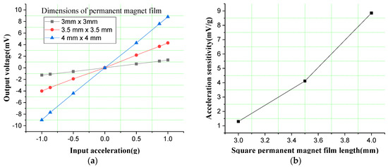 Acceleration input and output response characteristics experiments under different dimensions of permanent magnetic film are implemented to analyze the influence on the performance of the tunneling magnetoresistive accelerometer, shown in Figure 11. The experiment results illustrate that the signal sensitivity is proportional to the dimension of permanent magnetic film. When the dimension of the permanent magnetic film is widened from 3 mm × 3 mm to 4 mm × 4 mm, the sensitivity is increased by 6.81 times from 1.30 mV/g to 8.85 mV/g. This demonstrates that the area amplification of the magnetic field can significantly improve the mechanical displacement sensitivity and the magnetic field change rate due to a displacement variation along the z direction, and ultimately improve the signal sensitivity of the tunneling magnetoresistive accelerometer, which is consistent with the aforementioned simulation analysis.