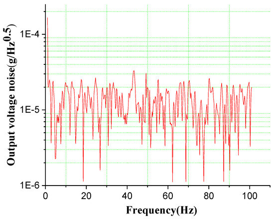 Finally, the stability and noise performance measures of the z-axis tunneling magnetoresistive accelerometer are implemented to evaluate the performance of the prototype. In order to optimize system performance, the gap and shift of the tunneling magnetoresistive sensor are slightly adjusted for maximum sensitivity along z-axis sensitive direction. The output voltage noise spectrum of prototype is shown in Figure 12.