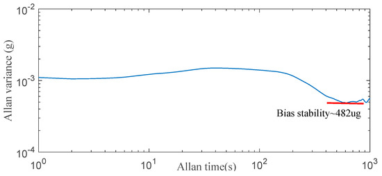 Experimental results demonstrate that the tunneling magnetoresistive accelerometer has a noise floor of 86.2 μg/Hz0.5 along z-axis sensitive direction. The noise comes from mechanical thermal noise of proof mass, resistance thermal noise of tunnel magnetoresistive sensor and circuit noise of the interface amplifier. The noisy force generator of mechanical thermal noise corresponds to an equivalent input acceleration an = (4kBTξ)0.5/(9.8m) [23]. Suppose the Boltzman’s constant kB = 1.38 × 10−23 J/K, the absolute temperature T = 300 K, the viscous damping coefficient ξ = 0.5 N/m/s (high air damping), m = 2.61 × 10−5 kg, the equivalent acceleration noise of the mechanical thermal noise of the proof mass is 0.36 μg/Hz0.5. Obviously, the main noise is dominated by the resistance thermal noise of tunnel magnetoresistive sensor and circuit noise of the interface amplifier, and the prototype of tunneling magnetoresistive accelerometer has a large potential for improvement. Simultaneously, a drift stability curve of the z-axis tunneling magnetoresistive accelerometer based on Allan variance is shown in Figure 13 [24]. Allan variance analysis illustrates that the tunneling magnetoresistive accelerometer has a bias stability of 482 μg along z-axis sensitive direction. In summary, the above experimental results prove that the scheme of z-axis tunneling magnetoresistive accelerometer is feasible and effective and achieves a considerable performance.
