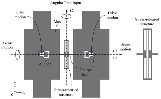 Figure 1 shows the vertical-view of the developed sensing structure of the BFVG used in this paper. The sensing structure includes four proof-masses (two masses are connected, they are symmetrically distributed at the anchor point), two cantilever beams, one stress-released structure, one oblique beam, and two anchors. There is an electrode gap between the sensing structure and the electrode structure after bonding.
