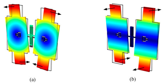 The BFVG has two orthogonal operation modes: drive mode and sense mode. The flexural vibration of the oblique beam will cause the movement of the proof-masses in the tangential direction of the structural plane (drive mode), as shown in Figure 2a. The torsional vibration of the oblique beam will cause the movement of the proof-mass in the normal direction of the structural plane (sense mode), as shown in Figure 2b. The sensing structure of the BFVG operates at the resonant frequency of the drive mode under the excitation of the externally driving force. The four proof-masses move periodically at a constant frequency and amplitude. When there is an angular rate, the Coriolis force will couple the drive mode to the sense mode. The input angular velocity can be obtained by measuring the displacement of the coupled vibration [6].