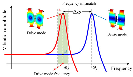 According to the operating principle, the BFVG can be modeled as a mass-spring-damper system. For the BFVG, the resonant frequency of the sense mode is greater than that of the drive mode. It operates in the frequency mismatching mode (Figure 3). The frequencies of the drive and sense mode are and respectively. is the difference between the operating modes. It is one of the most important parameters that affect the performance of the BFVG.
