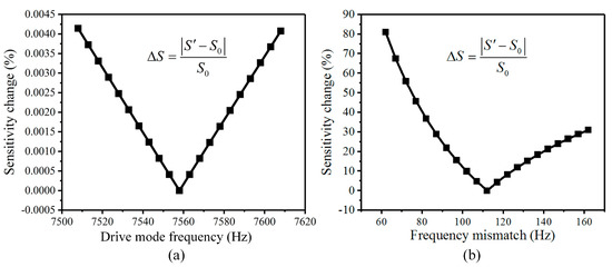 In order to reflect the relationship between the mechanical sensitivity and the operating frequency mismatch, the vibration amplitude of the drive mode is assumed to be a constant, and the size parameters and quality factors of the BFVG remain unchanged. According to Equation (5), the sensitivity equation can be simplified as