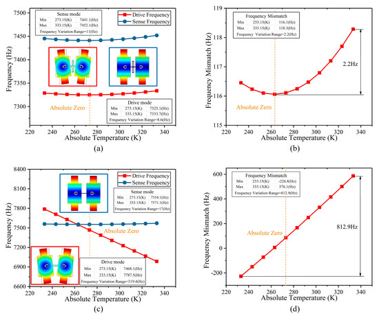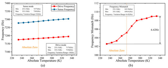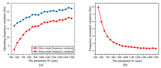 Firstly, the height of the stress-released structure (S1) was analyzed. S1 ranges from 550 μm to 1500 μm. The temperature characteristics of the operating frequency and the frequency mismatch of the BFVG in the whole temperature area were simulated respectively in different sizes. Figure 6a shows the total variation of the frequency in the whole temperature range under different S1 parameters. The transverse coordinate of the figure is the range of parameter S1, and the vertical coordinate is the maximum variation of the frequency of the gyroscope’s drive and sense modes in the full range of absolute temperatures from 230 K to 340 K under the specified parameters S1. The red curve is the change of the drive mode frequency, and the blue curve is the change of the sense mode frequency. The analysis shows that the total change in the whole temperature range of the operating frequency increases with the increase of stress-released structure height. Figure 6b shows the total variation of the frequency mismatch in the whole temperature range under different S1 parameters. The transverse coordinate of the figure is the range of parameter S1, and the vertical coordinate is the maximum variation of the frequency mismatch of the gyroscope in the full range of absolute temperatures from 230 K to 340 K under the specified parameters S1. The total variation of the frequency mismatch decreases, rapidly, when the height of the stress-released structure ranges from 550 μm to 750 μm. After that, when S1 increases, the frequency mismatch variation is basically stable.