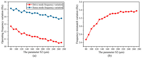 The parameter of the width of the stress-released structure (S2) affected the variation of the operating frequency and frequency mismatch: (a) The degree of variation of the operating frequency; (b) the degree of variation of the frequency mismatch.