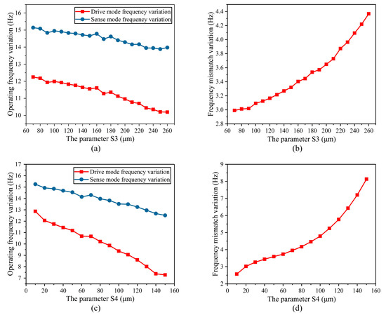 The parameters of the height of the internal fixed frame of the stress-released structure (S3) and the height of the outer fixed frame of the stress-released structure (S4) were analyzed. These two parameters mainly determine the height of the stress-release groove, so they have been analyzed together. As the height of the internal fixed frame of the stress-released structure needed to be wider than the gyroscope’s oblique beam, the dimension range of S3 was selected from 70 μm to 260 μm. The height of the outer fixed frame of the stress-released structure (S4) had no special requirements, so the dimension range of S4 was selected from 10 μm to 150 μm. The temperature characteristics of the operating frequency and the frequency mismatch of the BFVG in the whole temperature area were simulated respectively in different sizes. The simulation results are shown in Figure 8. The simulation results show that when S3 and S4 increases, the variation of the operating frequency in the whole temperature range decreases and the variation of the frequency mismatch increases. As can be seen from the above analysis, the variation of the frequency mismatch has a more significant impact on the BFVG’s sensitivity. Therefore, under the comprehensive consideration of the degree of the variation of the BFVG’s operating frequency, the size parameters with a small variation of the frequency mismatch are selected.