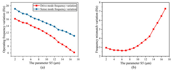 The parameter of the width of the stress-release groove (S5) affected the variation of the operating frequency and frequency mismatch: (a) The degree of variation of the operating frequency; (b) the degree of variation of the frequency mismatch.