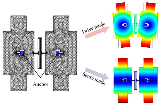 Taking the BFVG with new stress-released structure model as an example, after meshing in the COMSOL software, the symmetry distribution anchors are fixed as shown in Figure 10. The frequency parameterized scanning is carried out in the full range of absolute temperatures from 230 K to 340 K. The drift degree of the frequencies of the drive and sense modes by temperature change are obtained respectively.