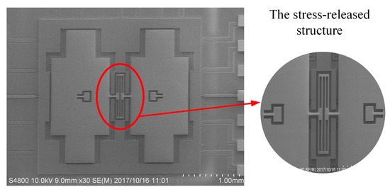 In order to reduce the structural thermal stress caused by the mismatch of material properties, this BFVG is made using all-silicon material. Through the reasonable fabrication processes, the BFVG with the new stress-released structure has been manufactured. The electron microscope of the BFVG is shown in Figure 12 (the package cap is removed). The machined dimensions of the stress-released structure of the BFVG are measured. The width of the stress-released beams is identical. After that, the performance of the BFVG will be tested, including the thermal stress, the quadrature trimming, and the Allan deviation. The experimental results show that the optimum design of the BFVG can effectively improve the performance.