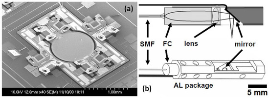 (a) Scanning electron micrograph of the MEMS two-axis optical scanner. The scanner has a large 1 mm diameter mirror and uses angled vertical comb (AVC) actuators to produce a large angle scan for high-resolution imaging. (b) Optical schematic and mechanical drawing of the optical coherence tomography (OCT) catheter endoscope. SMF: single mode fiber, FC: fiber collimator, AL: aluminum. Reproduced with permission from [28]; published by OSA, 2007.