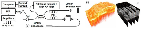 Among the variety of micro-devices, the electrostatic comb-drive-actuated MEMS scanner is a popular one [24,25,26,27,28,29]. For example, one of the representative MEMS-based OCT microendoscopes, as shown in Figure 1 [28], has utilized an electrostatic MEMS scanner [25] driven by angled vertical comb (AVC) actuators for a large tilting angle. The effective mirror aperture’s diameter is as large as 1 mm, which is sufficient to reflect the light beam for side-view high-resolution imaging with the MEMS-based endoscopic catheter. The single-mode fiber (SMF), fiber collimator, and the MEMS scanner are fully integrated in an aluminum-based packaging. The detailed fiber-based optical system design of the time-domain OCT imaging system and the real-time data acquisition system with high sampling speed are illustrated in Figure 2a. Three-dimensional OCT image volumes acquired in vitro from a hamster cheek pouch are shown in Figure 2b. Both horizontal (also called en-face) and vertical cross-sectional plane images extracted from the 3D OCT volume, in Figure 2c, have demonstrated high-resolution morphological changes inside the tissue specimen.