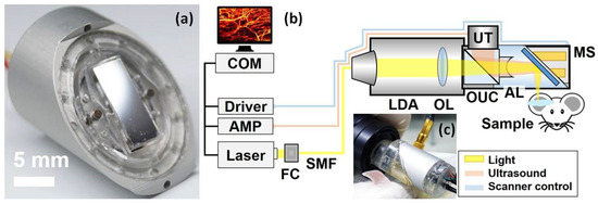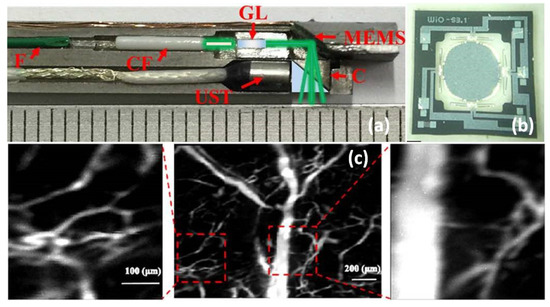 Based on an advanced ultra-compact electrothermal MEMS 2D scanner, a novel miniaturized MEMS-based photoacoustic (PA) microendoscope has been recently developed through collaborative team work led by Xi and Xie [44]. This work has been the most advanced PA microendoscopic imaging system and is close to clinical application. The cross-sectional view photograph of the endoscopic packaging is shown in Figure 7a, including a GRIN lens-based fiber-based collimator, electrothermal MEMS scanner, and optical and acoustic coupler. The new MEMS-based PA microendoscope can acquire high-resolution photoacoustic images of tissue specimens. The image performance of this new photoacoustic microendoscope has been demonstrated on a mouse ear, as shown in Figure 8c.
