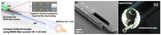 Electrothermal MEMS fiber scanner-based confocal microendoscope. (a) Schematic drawing of the catheter with a Lissajous scanner. The MEMS fiber scanner is fabricated for flip-chip bonding, which minimized the electrical packaging dimensions, resulting in the scanner package being 1.65 mm in diameter. (b) Top-view SEM image of the fabricated microactuator. The footprint dimension indicates 1 mm × 5 mm × 0.43 mm; (c) Photograph of the packaged catheter assembled to the laparoscopic functional channel. Reproduced with permission from [54]; published by OSA, 2018.