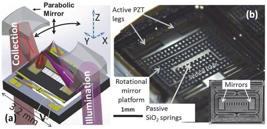 - Piyawattanametha, W.; Patterson, P.R.; Hah, D.; Toshiyoshi, H.; Wu, M.C. Surface-and bulk-micromachined two-dimensional scanner driven by angular vertical comb actuators. J. Microelectromechan. Syst. 2005, 14, 1329–1338. [Google Scholar] [CrossRef]