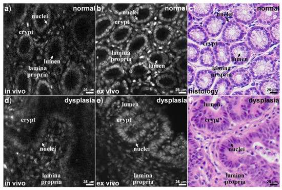 Fluorescent imaging results using the MEMS-based two-photon microendoscope. (a) Two-photon excited fluorescence image of normal colonic mucosa. (b) In-vivo image from normal averaged over five frames. (c) Corresponding histology of normal colon. Single frame from video of dysplastic crypts from colon of CPC; adenomatosis polyposis coli (Apc) mouse (d) In vivo at 5 frames/s and (e) In vivo image (averaged over five frames). (f) Corresponding histology of dysplasia. Reproduced with permission from [78]; published by OSA, 2015.