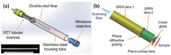 Based on the extensive experience on the multiphoton imaging system development, the team led by Li at Johns Hopkins University has recently developed a novel piezo tube-based fiber scanner-enabled miniaturized two-photon and second harmonic imaging system [85]. Aimed for label-free functional histology in vivo, the new fiber-optic scanning two-photon endomicroscope mainly consists of several key components, including a flexible double cladding fiber (DCF) for laser excitation and harvesting emission light, GRIN lens, and the very small piezo tube-based fiber scanner. A miniaturized custom-made objective with longitudinal focal shift has been developed by collaborating with GRINTECH (GmbH, Jena, Germany). A phase diffractive grating is sandwiched between two GRIN elements, as shown in Figure 14b.