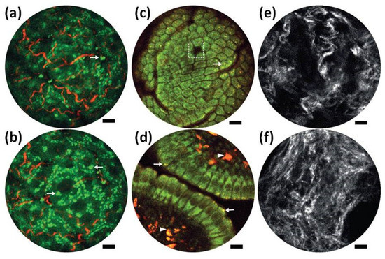 Endomicroscopy two-photon fluorescence (2PF) and second harmonic generation (SHG) label-free structural imaging. (a,b) Overlay of intrinsic 2PF and SHG ex vivo images of mouse liver. (c,d) Two-photon autofluorescence in vivo images of the mucosa of mouse small intestine. The two detection channels are 417–477 nm for NADH (green) and 496–665 nm for FAD (red). (e,f) SHG images of the cervical collagen fiber network acquired through intact ectocervical epithelium of cervices. Scale bars are 10 μm. Reproduced with permission from [85]; published by Nature, 2017.
