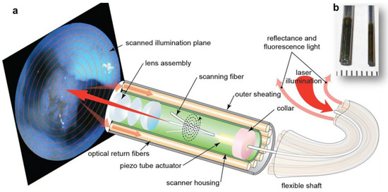 - Lee, C.M.; Engelbrecht, C.J.; Soper, T.D.; Helmchen, F.; Seibel, E.J. Scanning fiber endoscopy with highly flexible, 1-mm catheterscopes for wide-field, full-color imaging. J. Biophotonics 2010, 3, 385–407. [Google Scholar] [CrossRef] [PubMed]