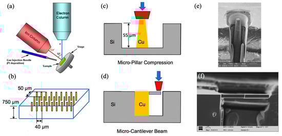 Through-silicon-via (TSV) specimens: (a) Focused ion beam scanning electron microscopy (FIB-SEM) dual beam system, (b) TSV in silicon substrate, schematics of (c) micro-pillar, (d) micro-cantilever experiments, SEM images of (e) micro-pillar adapted with permission from [], (f) cantilever beam specimens.
