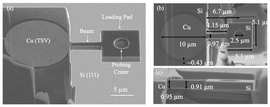 The as-received TSV structure has periodic blind Cu arrays in a (001) Si wafer with a depth of 780 µm. The nominal via diameter and depth were 10 and 55 µm with a pitch spacing of 40 µm along the (110) direction and 50 µm along the (100) direction of the wafer, as illustrated in Figure 1. Two types of miniature specimens were prepared: The micro-pillar and cantilever beam specimens. The micro-pillar specimens were prepared by dicing and polishing the silicon wafer to have one row of the via away from the free surface by a distance of 20 µm. For each micro-pillar specimen, the top 100 nm was removed to avoid the effect of surface roughness. The silicon around the selected via was then subsequently removed, following a pattern of a concentric ring with a 3 µm thickness, as illustrated in Figure 1e. The inner ring was set at the same size as the via diameter, the outer ring was then about 16 µm in diameter. Due to the tapering effect, the top diameter of the via after the milling was about 6 µm, which formed 2 degrees of tapering angle along the via length. The micro-cantilever beam specimens were milled out of the silicon matrix near the copper via using a similar beam energy (ranging from 3–300 keV) used for the micro-pillar specimens. The side view of the prepared micro-cantilever beam is shown in Figure 1f. More details of the fabricated micro-cantilever beam are shown in Figure 2. A total of six types of micro-cantilever beam specimens were prepared with various lengths ranging from 1 to 30 µm. The width and height of the beam were set to be close to 1 µm. A specially designed square loading pad was also fabricated at the end of the beam with a size of 5.1 µm (note that the length of the loading pad was excluded from the total length to obtain the beam length). A probing crater with a diameter of 2.5 µm was carved into the loading pad to avoid the slipping of indenter tip during loading. At the Cu/Si interface, a pre-milled notch with a length of 100 nm was created, serving at the pre-crack. A total of 3 specimens were fabricated for each type of the micro-cantilever beams.