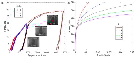 The force–displacement response obtained from a previous experiment [] is shown in Figure 3a. Observing these results from the previous work, significant plastic responses were observed, as indicated by the permanent deformation after each unloading. As explained in the previous work [], the residual deformations were also confirmed by the SEM images, shown in Figure 3a. To extract this observed elastic–plastic property, a finite element analysis was conducted, considering the tapering caused by non-uniform stress distribution [,]. The Ramberg–Osgood power-law relationship [] was adopted in the numerical models to compare with experimental results. The J-2 flow theory was used to model the Cu plasticity. The 4-node quadrilateral axis-symmetrical elements in commercial finite element code ABAQUS® (Abaqus Inc., Providence, RI, USA) were used for the finite element modeling. The Ramberg–Osgood power-law relationship has been widely used for the description of plastic strain hardening of nanoindentation experiments, the stress versus plastic strain curve based on this law showed good agreement with experimental data [,,]. In this relationship, the stress versus plastic strain response follows the description below,