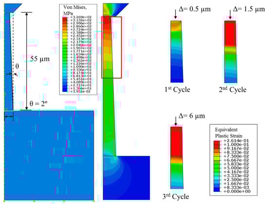 The extracted elastic–plastic properties of the copper were used to evaluate the fracture strength at the Cu/Si interface. More analysis details are shown in Figure 4, where both the von Mises stress and equivalent plastic strains show non-uniform distributions. The non-uniform distribution was an indication of the tapering effect and further demonstrated the needs of conducting finite element analysis (FEA) to extract the plastic properties of Cu. This result also shows that the nonlinear force–displacement response has geometrical effects. Stress and plastic strain contours for FE modeling of micro-pillar compression are shown in Figure 4, where yield stress and the Ramberg–Osgood parameter are taken to be 216 MPa and 3, respectively. The slight gradient shown in the contour plots was due to the tapered cross-section of the specimen.