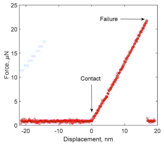 The force versus displacement response for a typical micro-cantilever beam specimen is shown in Figure 5. The early contact was established as shown by the turning point between the approaching and loading response. A linear response was observed followed by a sudden failure, in terms of the drop of the force from the peak value to zero. This sudden force drops indicated a brittle Cu/Si interface. The failed surface shown in Figure 6 was characterized using SEM and energy dispersive spectroscopy (EDS) as labeled out with the red box. The elements and weight percentage results are shown in Table 1. As listed, most of the elements detected were Cu, which was followed by Si and elements in the liner materials at the TSV/Cu interface (Fe, Ta, Os). This result is similar to that of the shear failure surface from the previous work []. As previously concluded, the majority of the Cu signal comes from the background Cu materials in the TSV, which indicated an interfacial failure locus within the silicon matrix. The Young’s modulus for Cu and Si are 110 and 165 GPa, respectively. The shear modulus used in the analysis for Cu and Si are 42.3 and 64.45 GPa, respectively, the Poisson’s ratios are 0.3 and 0.28, respectively.