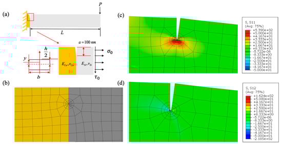 (a) Illustration of micro-cantilever beam with pre-crack, (b) FEA mesh details (yellow indicates Cu, grey indicates Si), (c) normal stress at the crack tip, (d) shear stress at the crack tip.