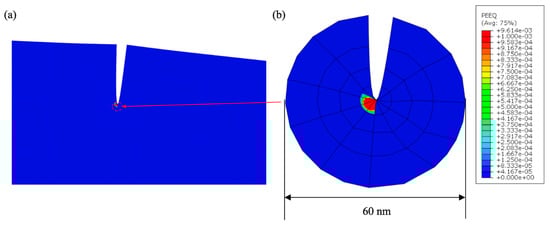 Non-linear fracture mechanical mode (NLEFM) analysis results of micro-cantilever beam for L = 4 µm: (a) Far-field view, (b) localized view near crack-tip showing equivalent plastic strain contour.