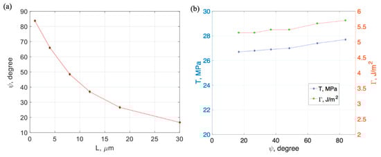 The phase angle versus the beam length (L) is plotted in Figure 9a. A decreasing trend was observed as the beam length increased. The range of the phase angle was from 16.7 to 83.7 degrees, covering most parts of the positive mode-mix (0–90°), which indicated completeness of the experimental data set in determining the fracture criterion at the Cu/Si interface.