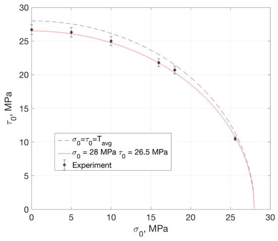 where are the fracture strengths for pure mode-I (normal) and mode-II (shear) and is a fitting parameter, which was set at 1.8. The measured experimental data are then fitted with the proposed failure criterion, as shown in Figure 10. The dashed blue line shows the fitting of experimental data with . The red solid line shows the fitting of . The better fitting of the experimental was observed when setting different fracture strengths for pure mode-I and mode-II. These results indicated that the mode-mix still had a moderate effect on the fracture strength, although the vectorial value stayed almost constant. When the combined normal and shear stress in the plane satisfy the condition of , the fracture initiation was not likely to occur.