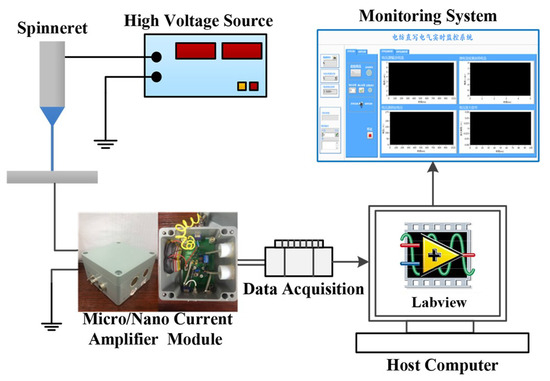 Figure 1. A precision syringe pump (Pump 11 Pico Plus Elite, Harvard Apparatus America, Cambridge, MA, USA) was used to supply the polymer solution, by which the solution rate can be adjusted accurately. The anode of the high-voltage DC power supply (DW-SA403-1ACE5, Dongwen high voltage power source Ltd., Tianjin, China) was connected to the stainless-steel nozzle as spinneret, and the cathode was connected to the grounded collector that was fixed on a XY motion platform (GXY1515GT4, Googoltech, Guangzhou, China). To amplify the micro/nano current, a designed micro/nano current amplifier module was connected to the collector, of which the output signal was acquired by a data acquisition card (16 Inputs, Multifunction I/O, National Instruments Corporation, Austin, TX, USA) and transmitted to the host computer in real time. A CCD camera (SSC-DC80, Sony Corporation, Tokyo, Japan) was used to observe the jet motion behaviors.