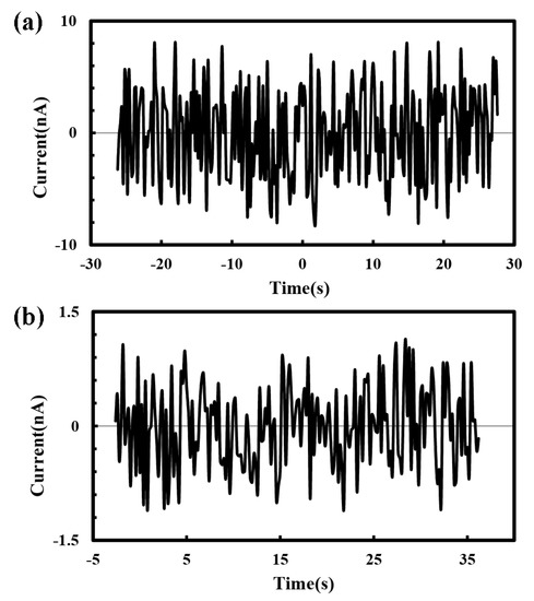 Noise of micro/nano current measurement system without an external load. Current amplitude: (a) Lower than 250 nA; (b) Higher than 250 nA. The applied voltage and the distance between spinneret and collector were 3 kV and 6 mm, respectively.