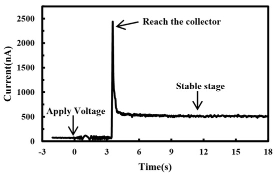 Time response of electrohydrodynamic direct-written current. The applied voltage, the distance between spinneret and collector, the solution concentration and the solution supply rate were 3 kV, 6 mm, 10%, and 100 μL/h, respectively.