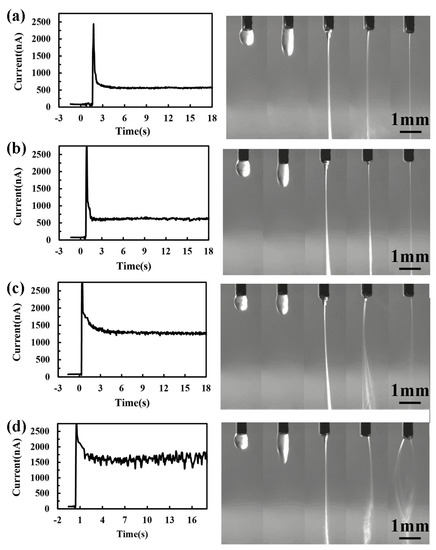 Relationship between electrohydrodynamic direct-written current and ejection time under different applied voltages: (a) 3.3 kV; (b) 3.6 kV; (c) 3.9 kV; and, (d) 4.2 kV. The distance between spinneret and collector, the solution concentration and the solution supply rate were 6 mm, 10%, and 100 μL/h, respectively.