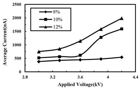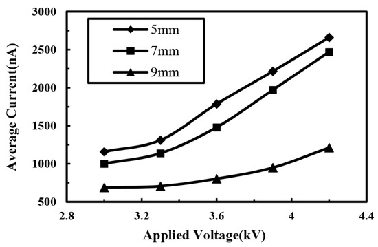 Figure 6. As the applied voltage increased, the intensity of the space electrical field increased, while the surface charge density of the jet and the moving speed of the jet also increased, so that the average direct-written current increased accordingly. When the distance between the spinneret and the collector increased, the spatial electrical field strength decreased, so that the average direct-written current decreased. When the distance was smaller, the effect of voltage acted a more obvious effect on the direct-written current and the direct-written current increased at a higher rate, as depicted in