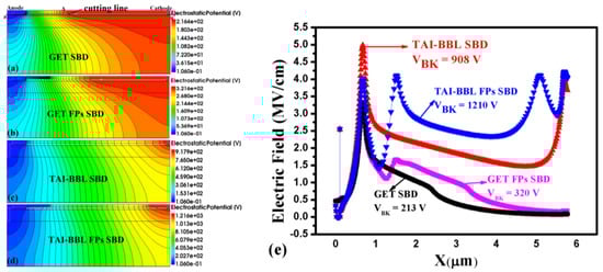 Figure 4. The equipotential line profile of: (a) GET SBD, (b) GET FP SBD, (c) TAI-BBF SBD, (d) TAI-BBF FP SBD when breakdown occurs, (e) The corresponding horizontal electric field distribution in the 2DEG area.