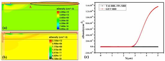 Figure 5. The electron concentration distribution of: (a) GET SBD, (b) the TAI-BBL FP SBD when the breakdown occurs, (c) the corresponding curve distribution.