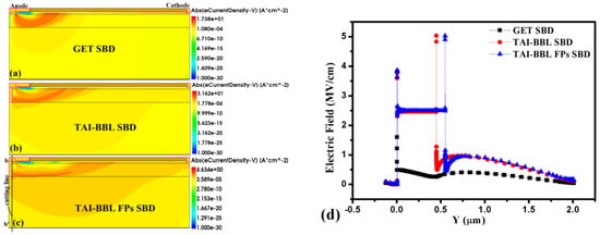 Figure 6. The path of the anode leakage current of: (a) GET SBD, (b) TAI-BBF SBD, (c) TAI-BBF FP SBD, (d) the corresponding vertical electric field distribution under the SC.