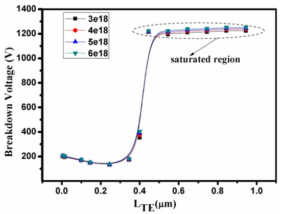 The dependence of the breakdown characteristic on the length of the T-anode and the concentration of the acceptor traps in the bottom buffer layer are plotted in Figure 7. Initially, the length of the T-anode from 0 to 0.3 μm was far from the bottom buffer layer, resulting in a low VBK. When the length of the T-anode exceeded 0.3 μm, the VBK began to increase sharply. Eventually, the VBK achieved a saturation value when the length of T-anode reached 0.845 μm. Thus, the VBK depended on the distance between the T-anode and the bottom buffer layer, as is evident from Figure 6. The concentration of acceptor traps versus the VBK are also shown in Figure 7. However, when the concentration of the acceptor traps of bottom buffer layer increased from 3 × 1018 cm−3 to 6 × 1018 cm−3, the VBK remained constant. With the doping concentration of the acceptor traps of 6 × 1018 cm−3, VBK = 1252V was obtained for a T-anode length of 0.845 μm. In particular, changing the concentration of the acceptor traps of the bottom buffer layer had a negligible effect on the forward characteristics, as the bottom buffer layer was far from the GaN channel layer.
